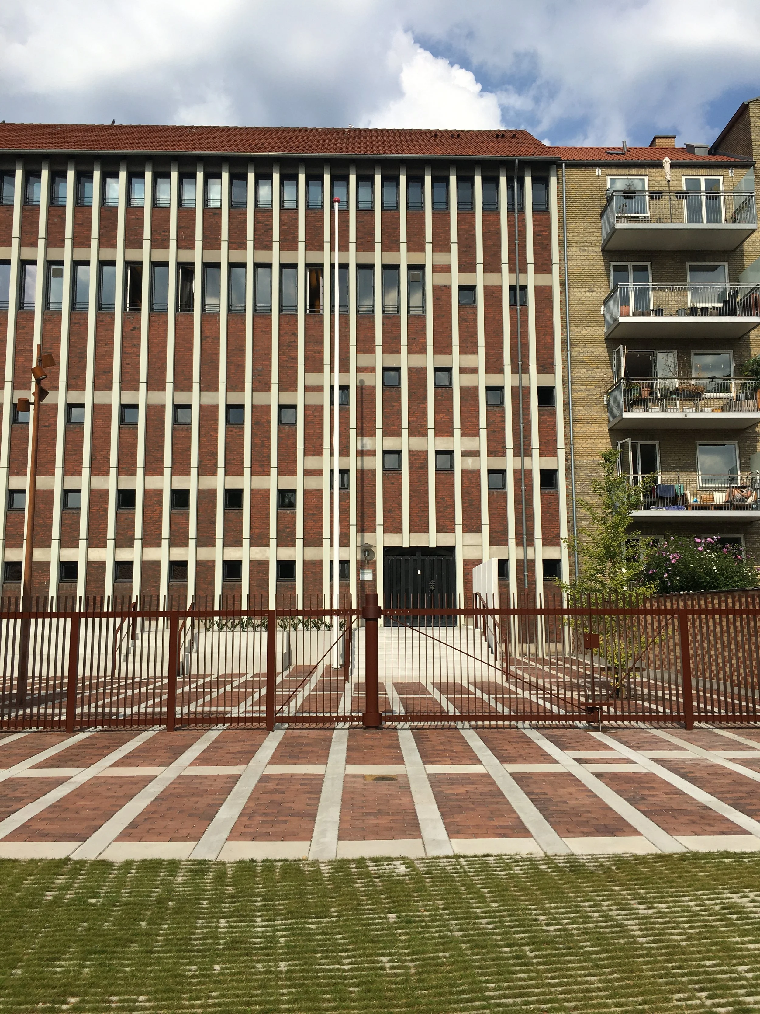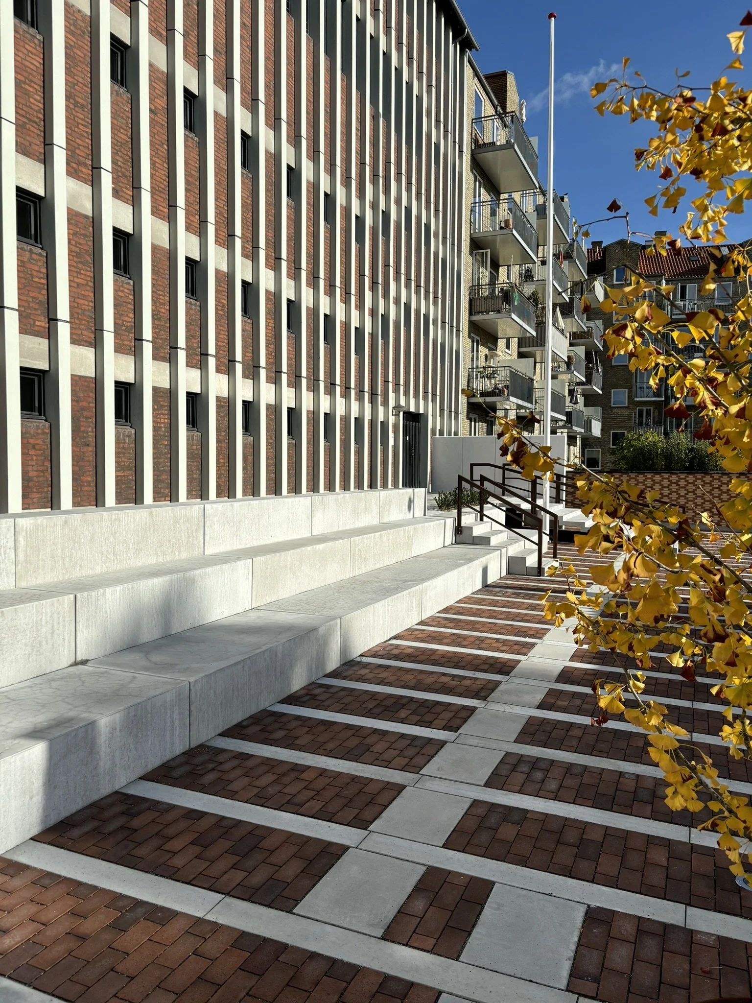 Materialerne mimer facadens røde tegl og grå beton for at give sammenhængskraft mellem bygning og kirkeplads. Låger og trappeværn udføres ligeledes i samme rødbrune farve som teglbelægningen.