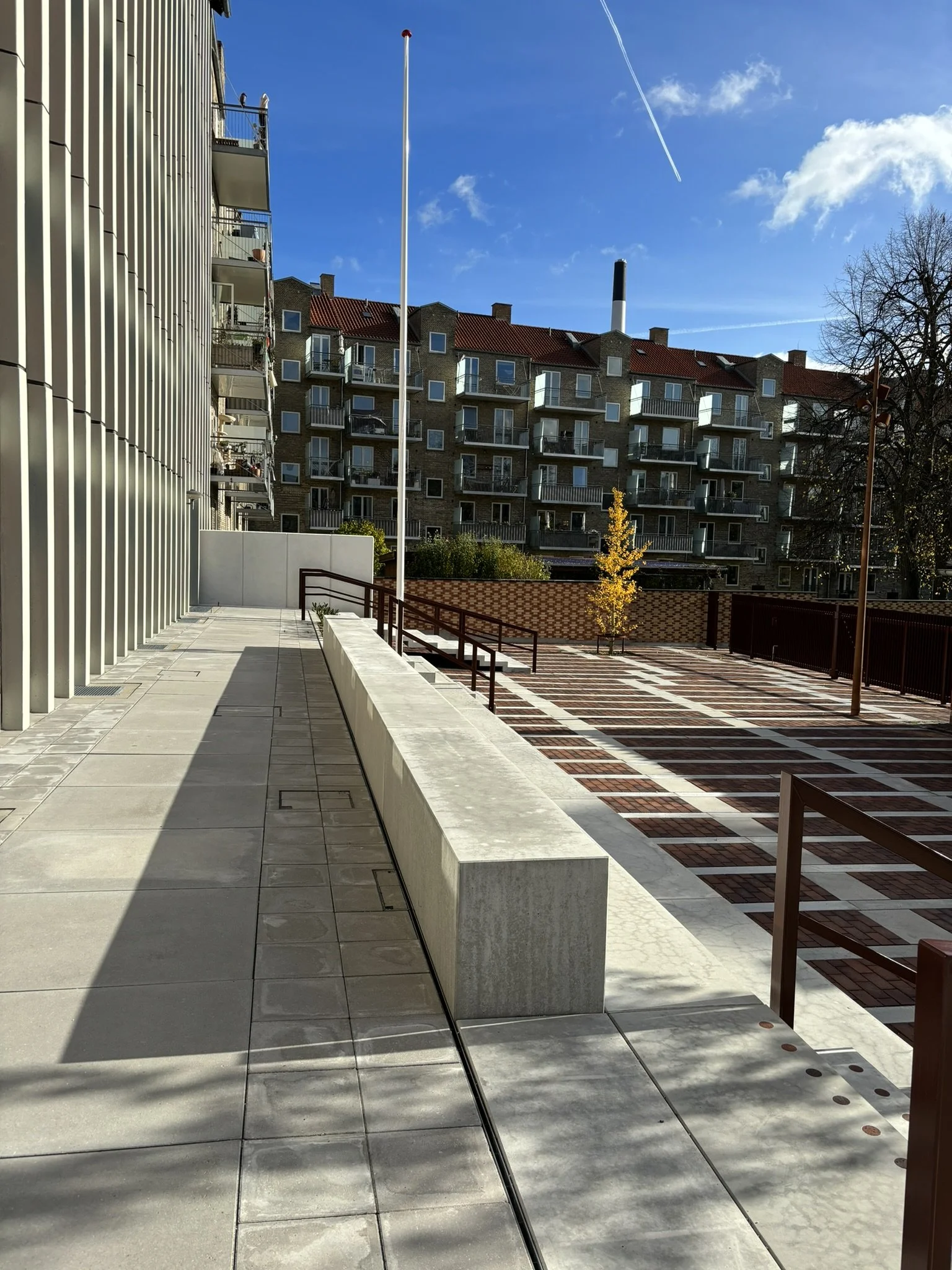Den oprindelige betonmur langs kirken afløses af et langstrakt podielandskab med opholdspladser og mulighed for at afholde de kirkelige handlinger i det fri.