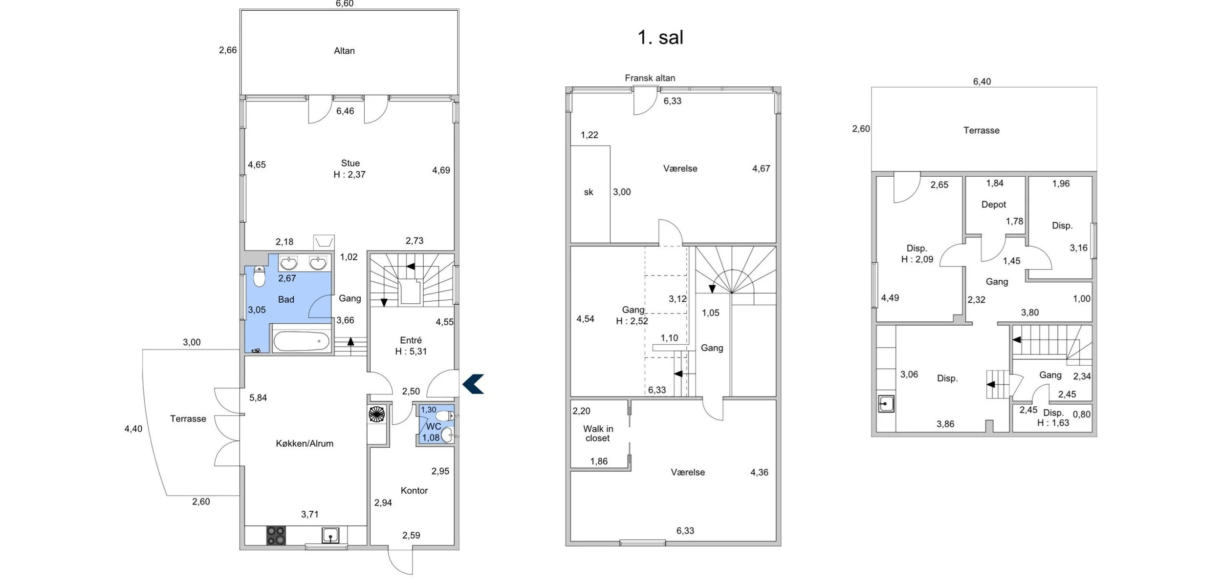 Ombygningen indbefatter øgning af husets højde, så tagetagen kan udnyttes til beboelse. Indgangen er placeret midt i huset for at optimere rumfordelingen, og den nye interne trappe er udført som en åben trappe i et dobbelthøjt fordelingsrum med ovenlys.