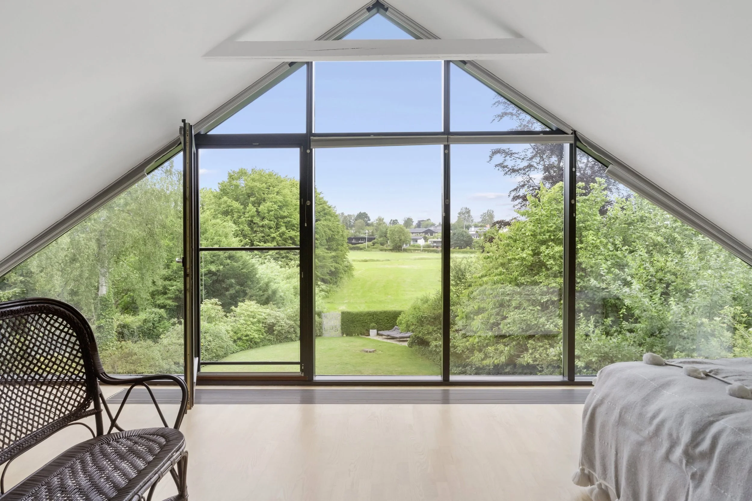 Huset åbner sig op med store glaspartier mod engarealet. Glasset føres rundt om hjørnerne, så udsynet ud mod engarealet forstærkes horisontalt som vertkalt..