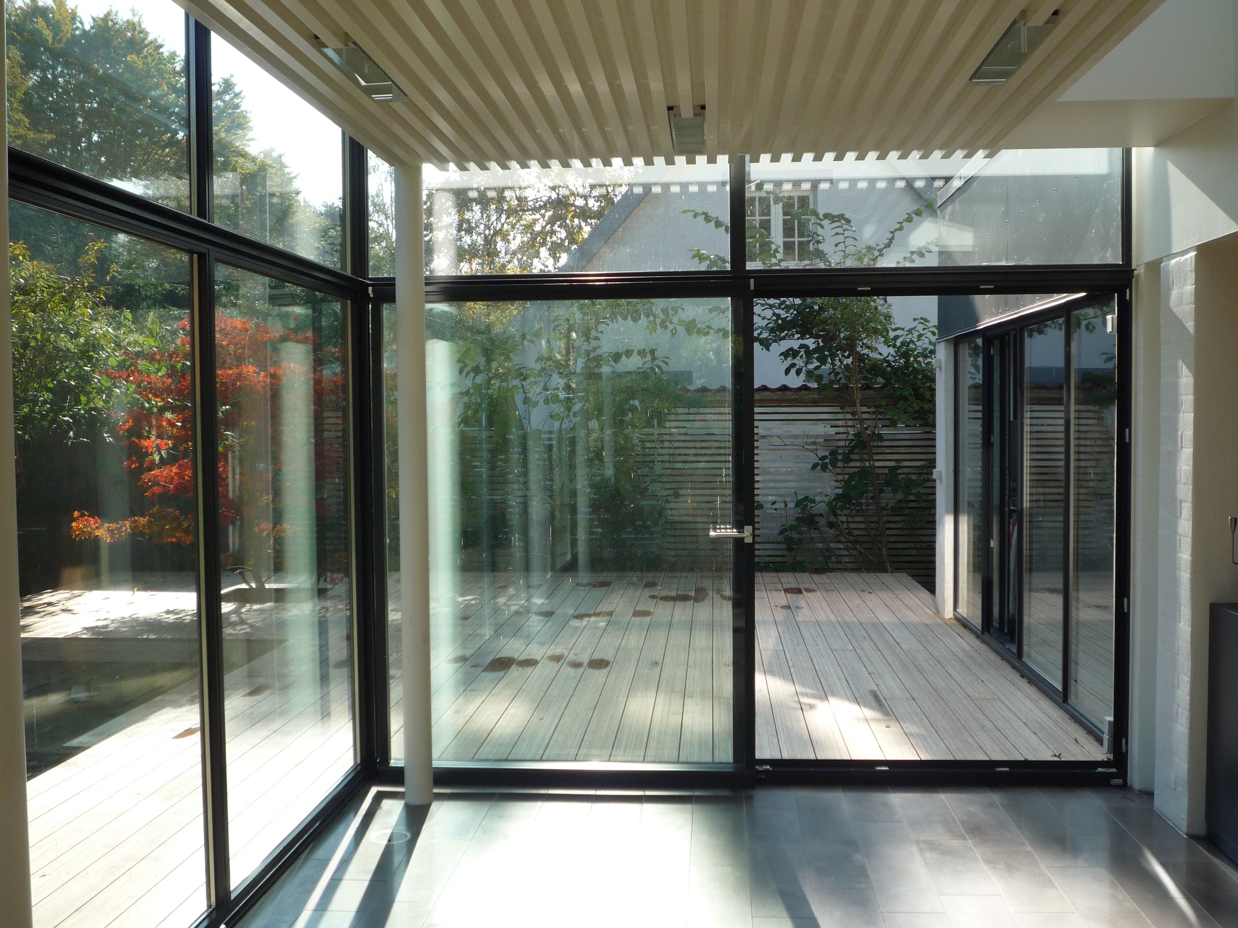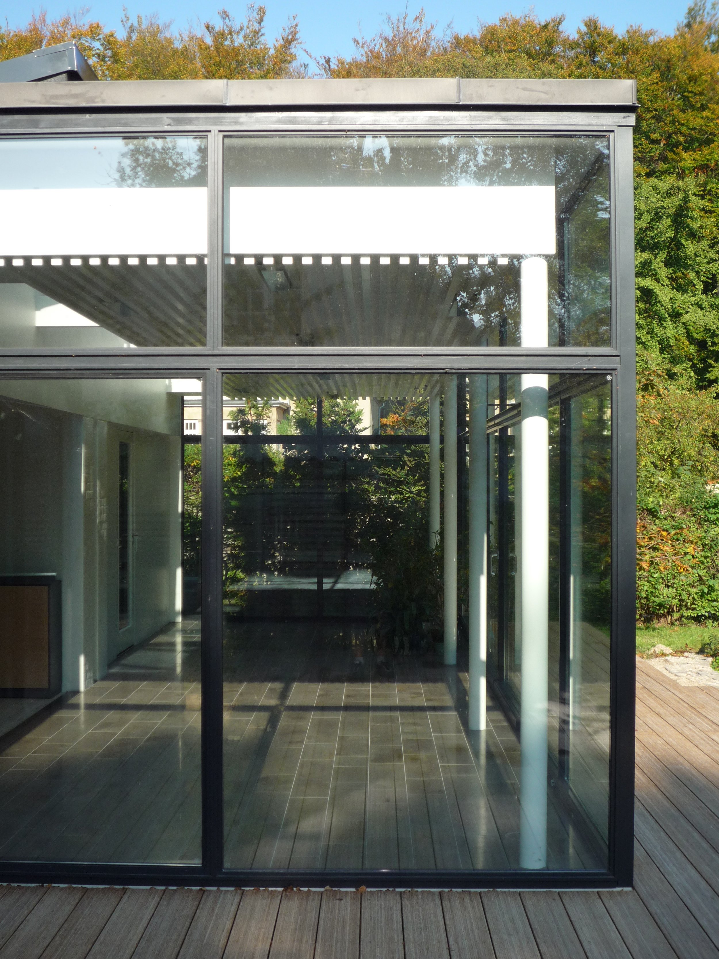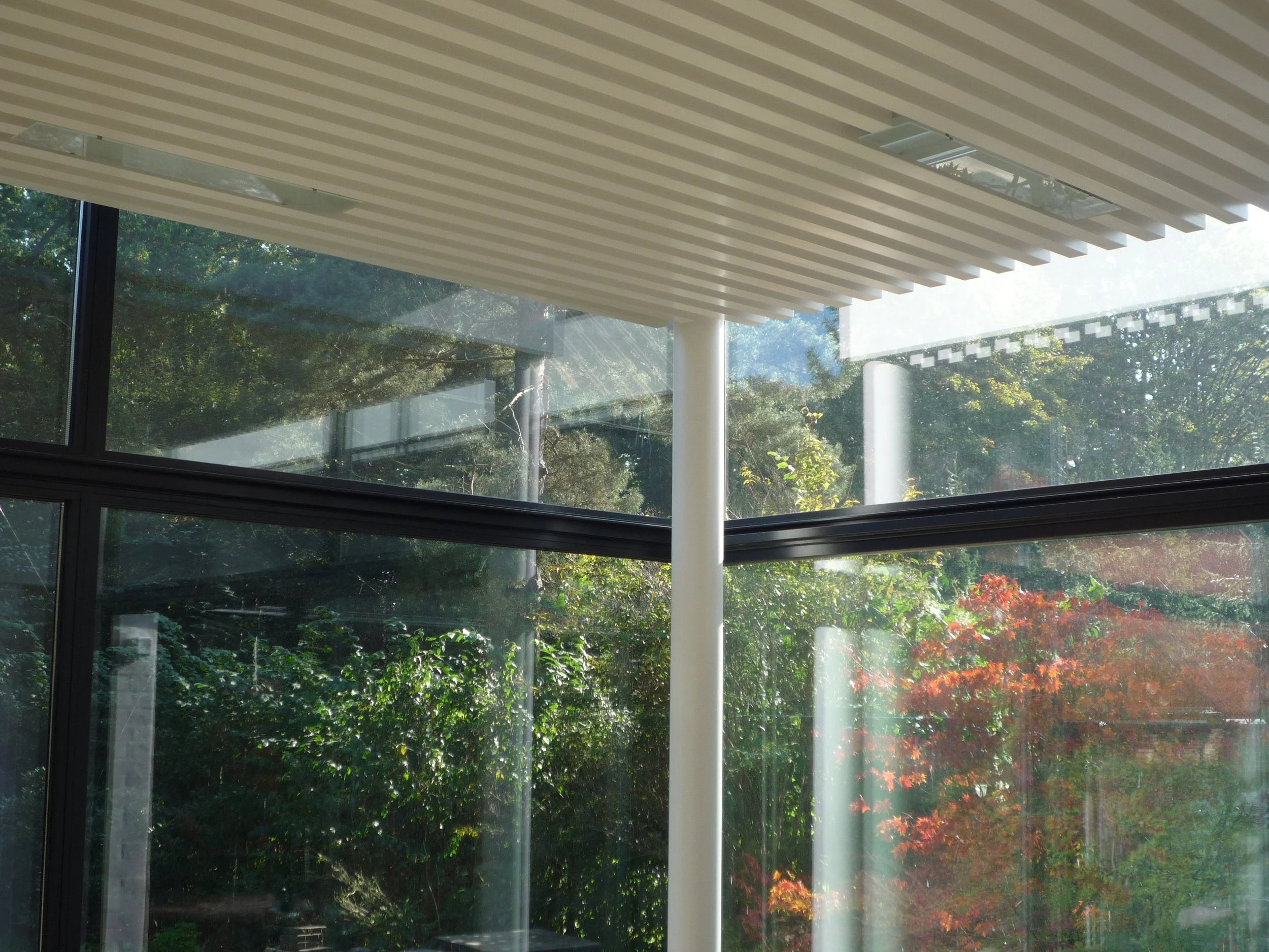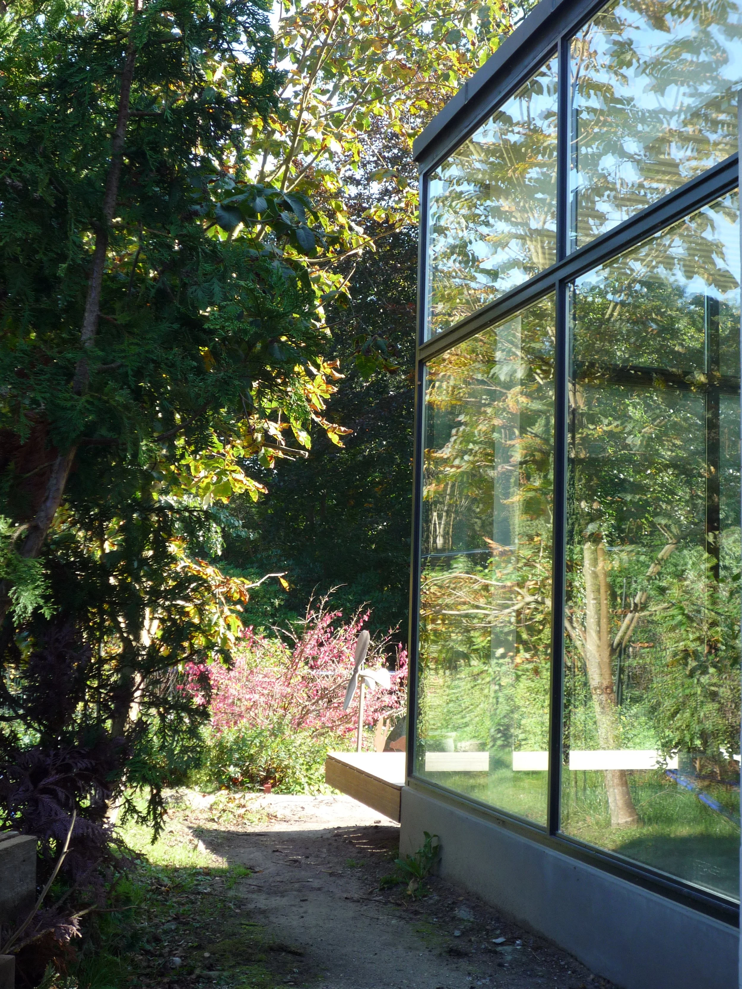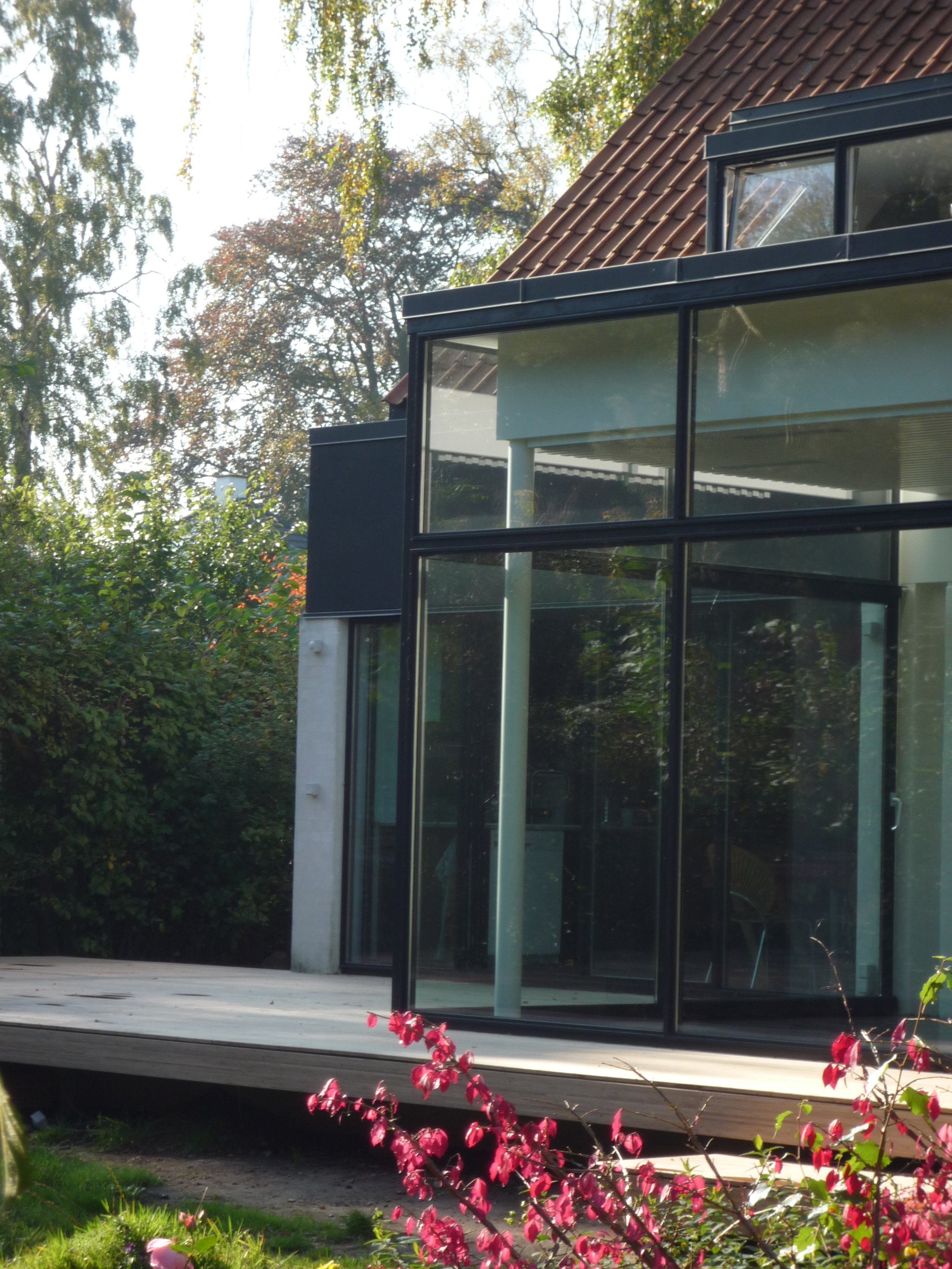 Det særlige ved stedet er det nære skovbryn med kig ind mellem skovens lodrette stammer og flimrende trækroner. Tilbygningen er placeret på langs af huset mod skovbrynet. Facaden på tilbygningen er ført op over tilbygningens loft, så blikket løftes op ad mod himlen og de høje trækroner. Tilbygningen bæres af tynde stålsøjler, så facaden mod skovbrynet opleves let og transparent.